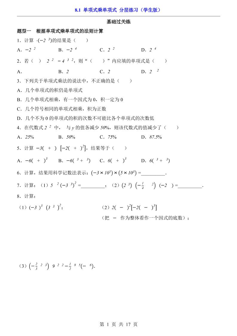 8.1 单项式乘单项式(分层练习)