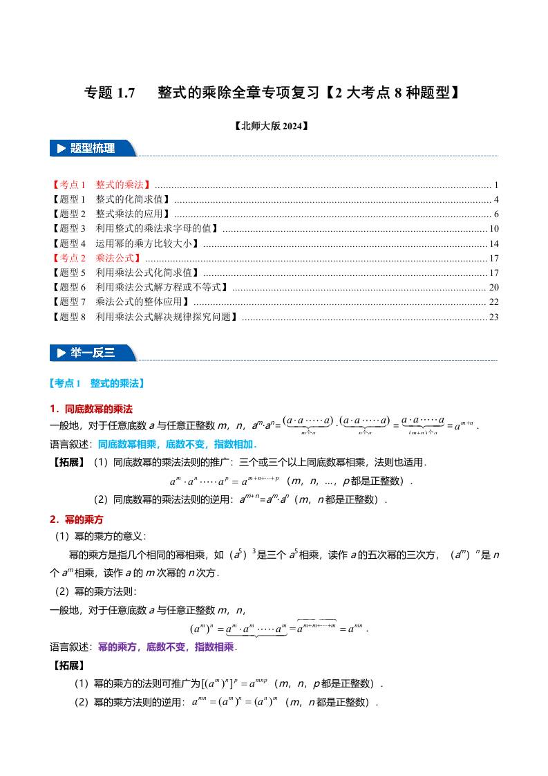 专题1.7 整式的乘除全章专项复习【2大考点8种题型】(举一反三)(北师大版2024)(原卷版)