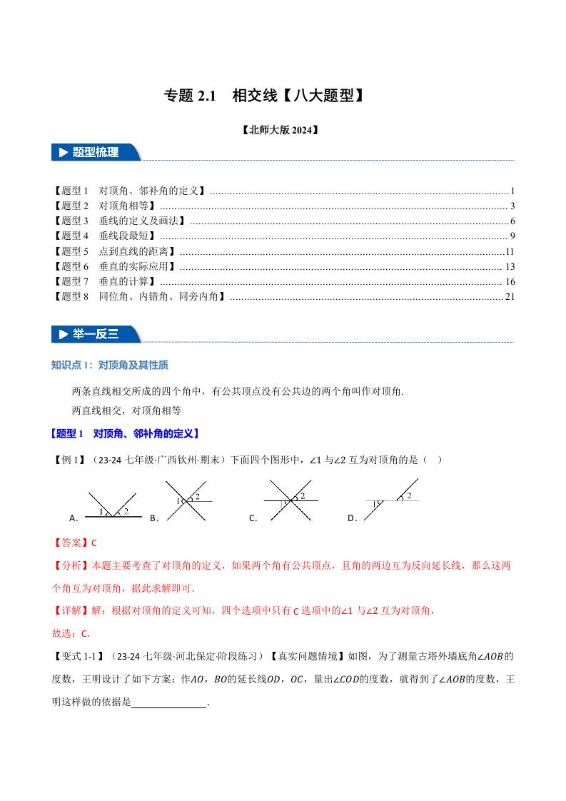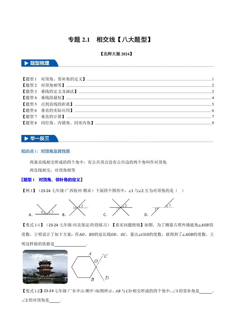 专题2.1 相交线【八大题型】(举一反三)(北师大版2024)(原卷版)