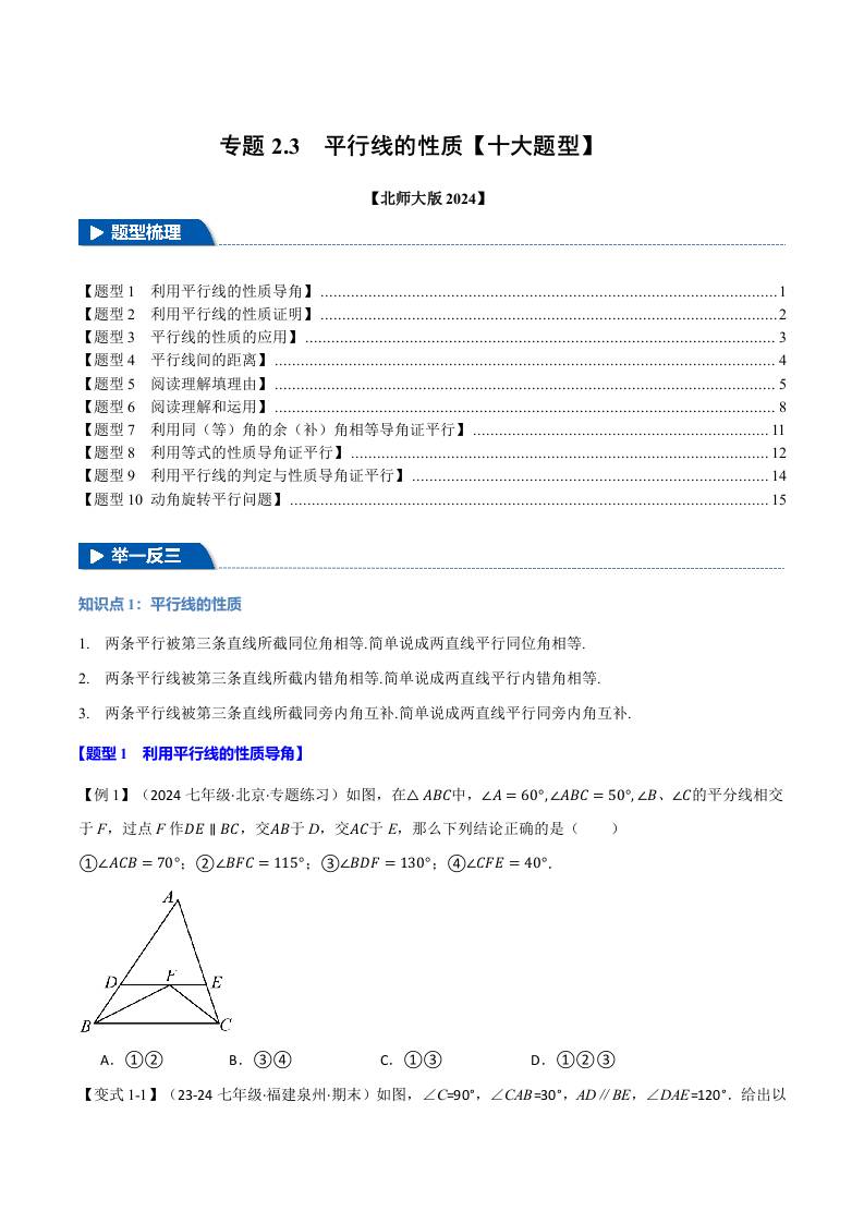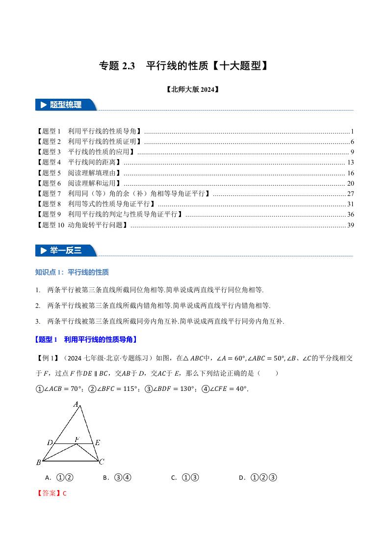 专题2.3 平行线的性质【十大题型】(举一反三)(北师大版2024)(原卷版)