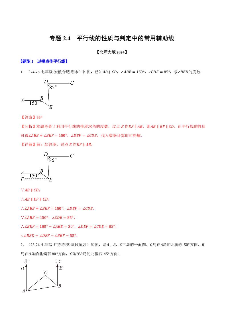 专题2.4 平行线的性质与判定中的常用辅助线(北师大版2024)(解析版)