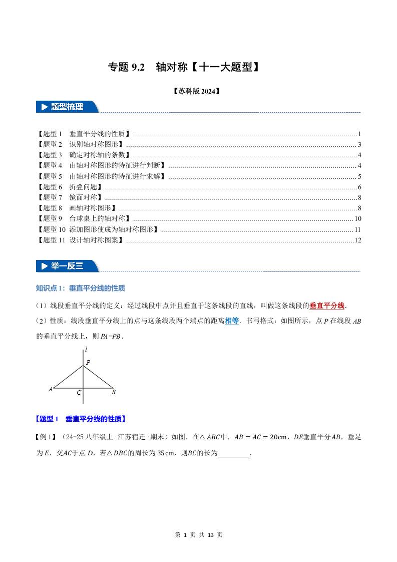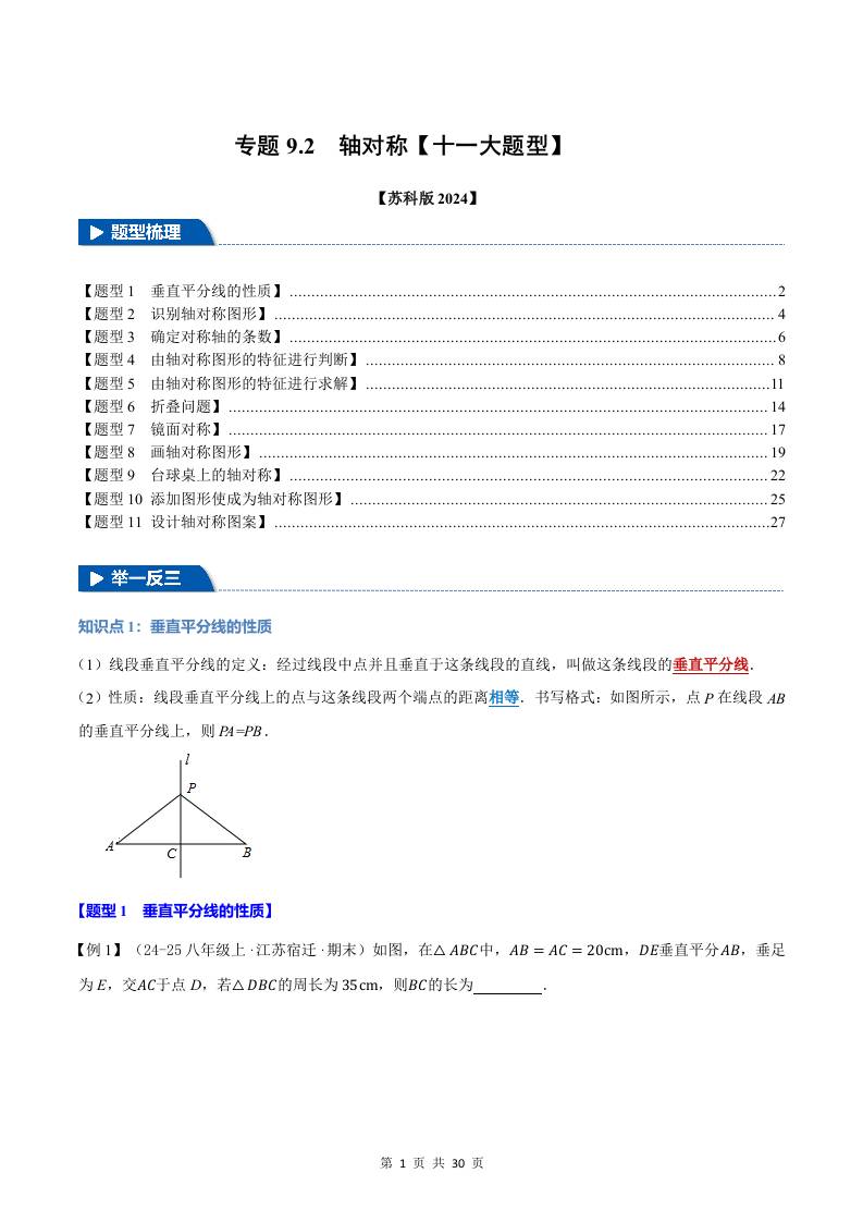 专题9.2 轴对称【十一大题型】(举一反三)(苏科版2024)(原卷版)