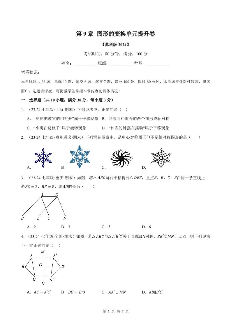 专题9.4 图形的变换单元提升卷(苏科版2024)(原卷版)