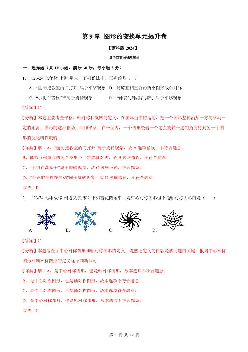 专题9.4 图形的变换单元提升卷(苏科版2024)(解析版)