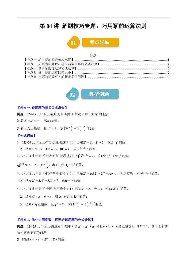第一章第04讲 解题技巧专题:巧用幂的运算法则(5类热点题型讲练)(原卷版)