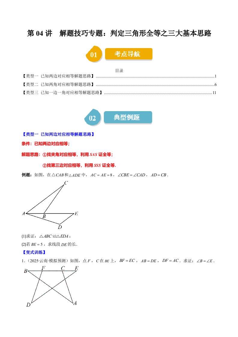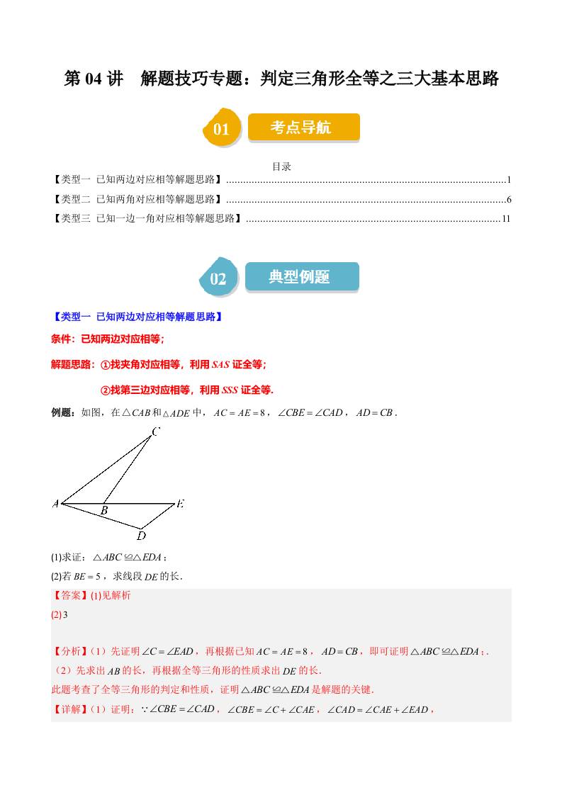 第四章第04讲 解题技巧专题:判定三角形全等之三大基本思路(3类热点题型讲练)(学生版)