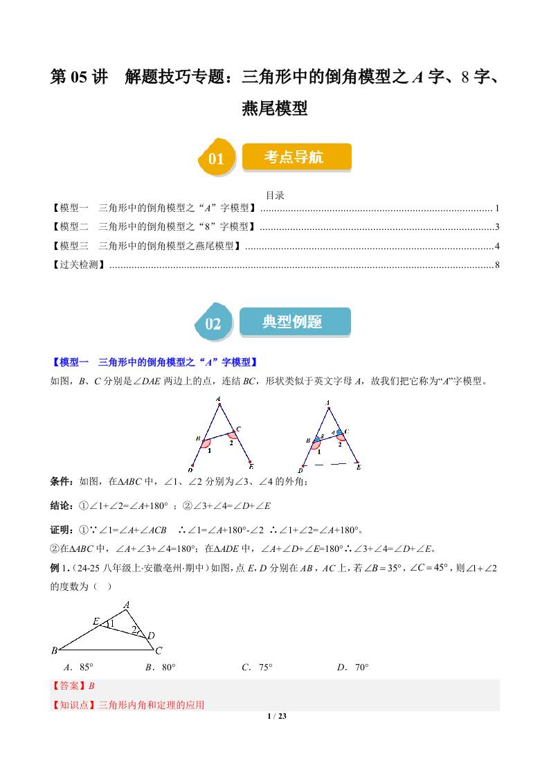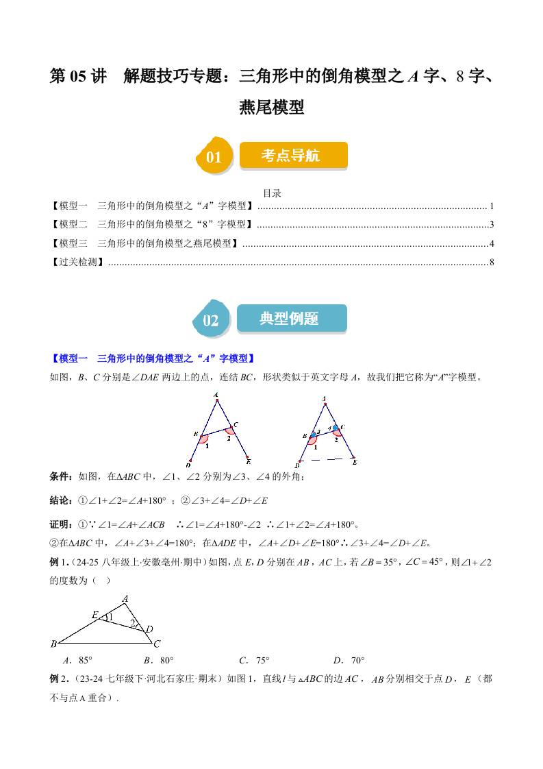 第四章第05讲 解题技巧专题:三角形中的倒角模型之A字、8字、燕尾模型(3类热点题型讲练)(学生版)