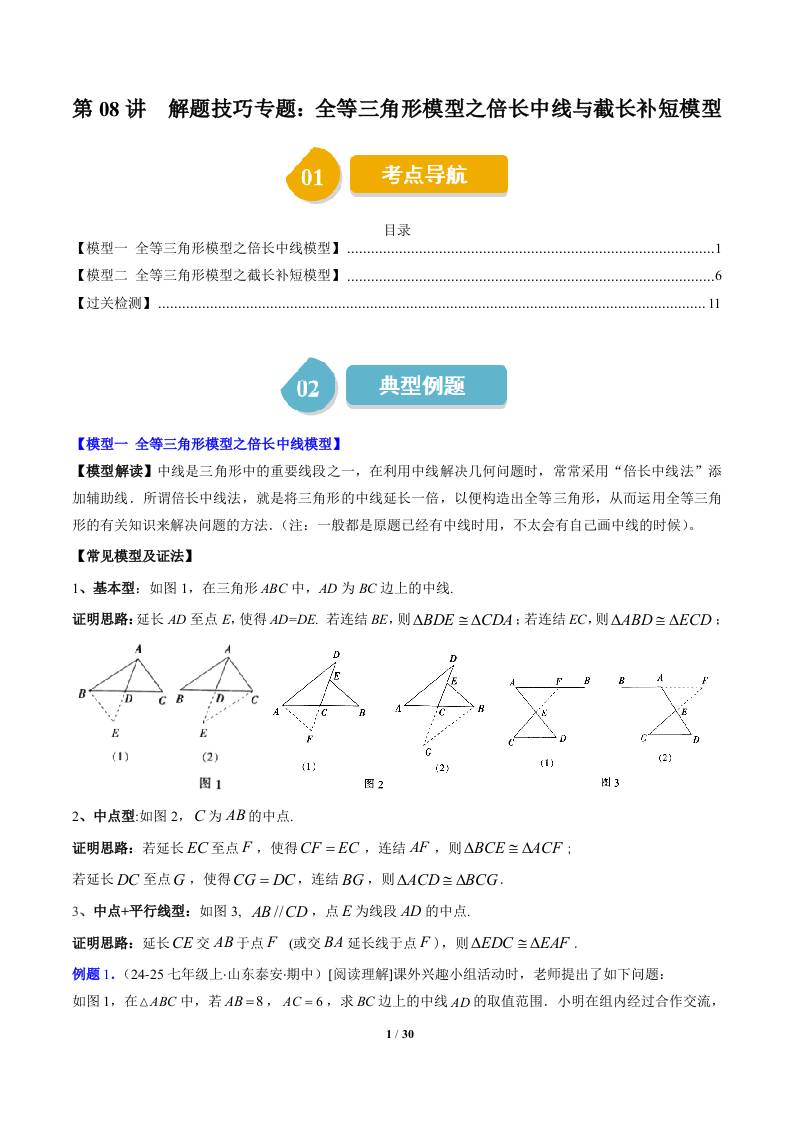 第四章第08讲 解题技巧专题:全等三角形模型之倍长中线与截长补短模型(2类热点题型讲练)(教师版)