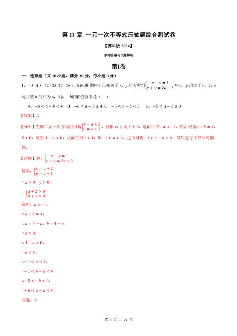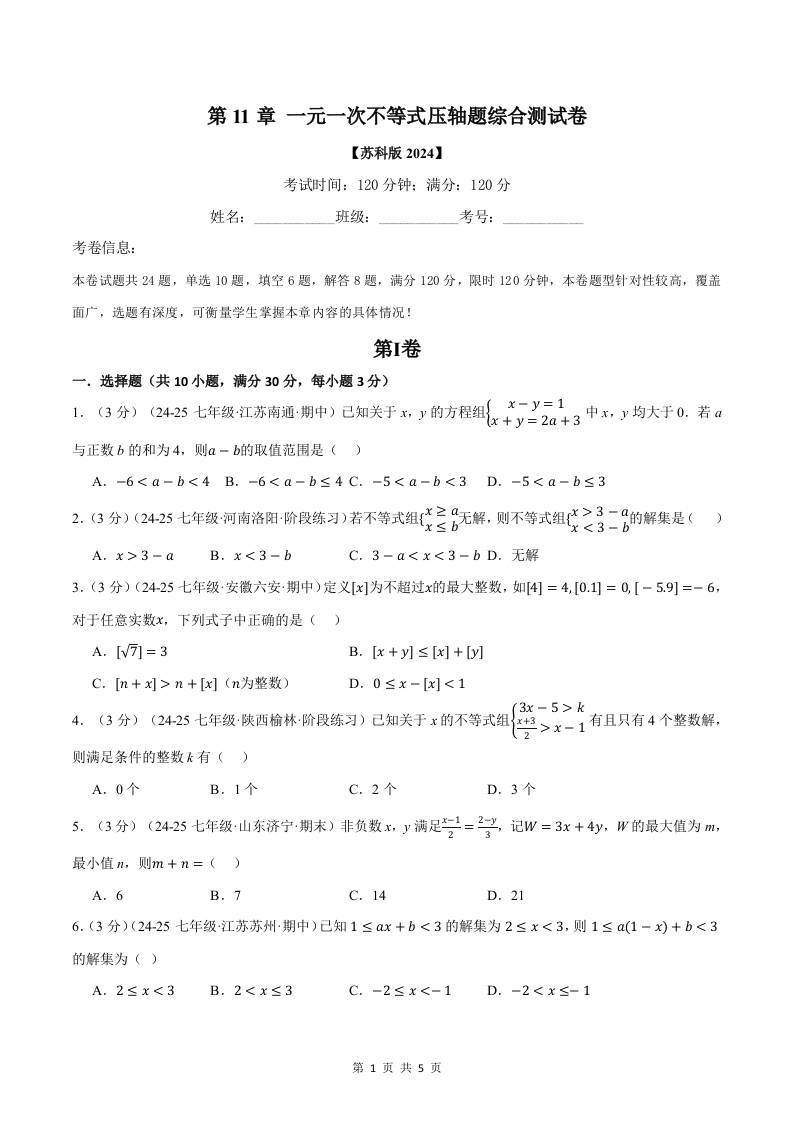 专题11.9 一元一次不等式压轴题综合测试卷(苏科版2024)(原卷版)