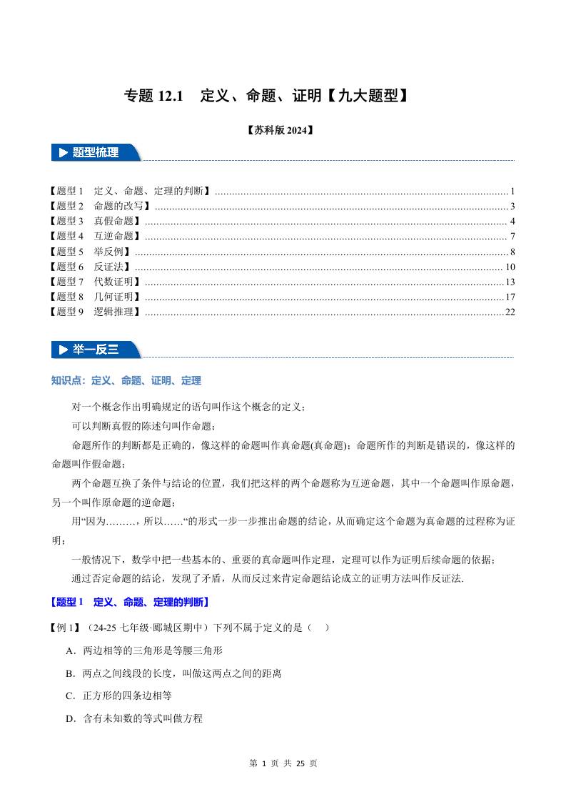 专题12.1 定义、命题、证明【九大题型】(举一反三)(苏科版2024)(原卷版)
