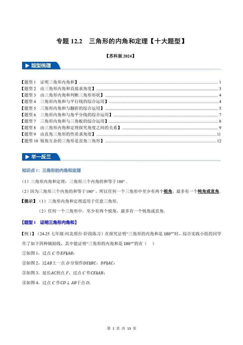 专题12.2 三角形的内角和定理【十大题型】(举一反三)(苏科版2024)(解析版)