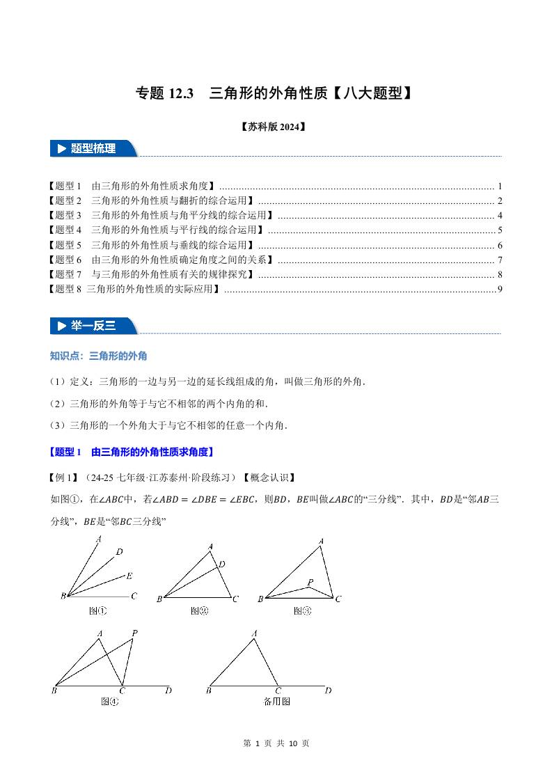 专题12.3 三角形的外角性质【八大题型】(举一反三)(苏科版2024)(原卷版)
