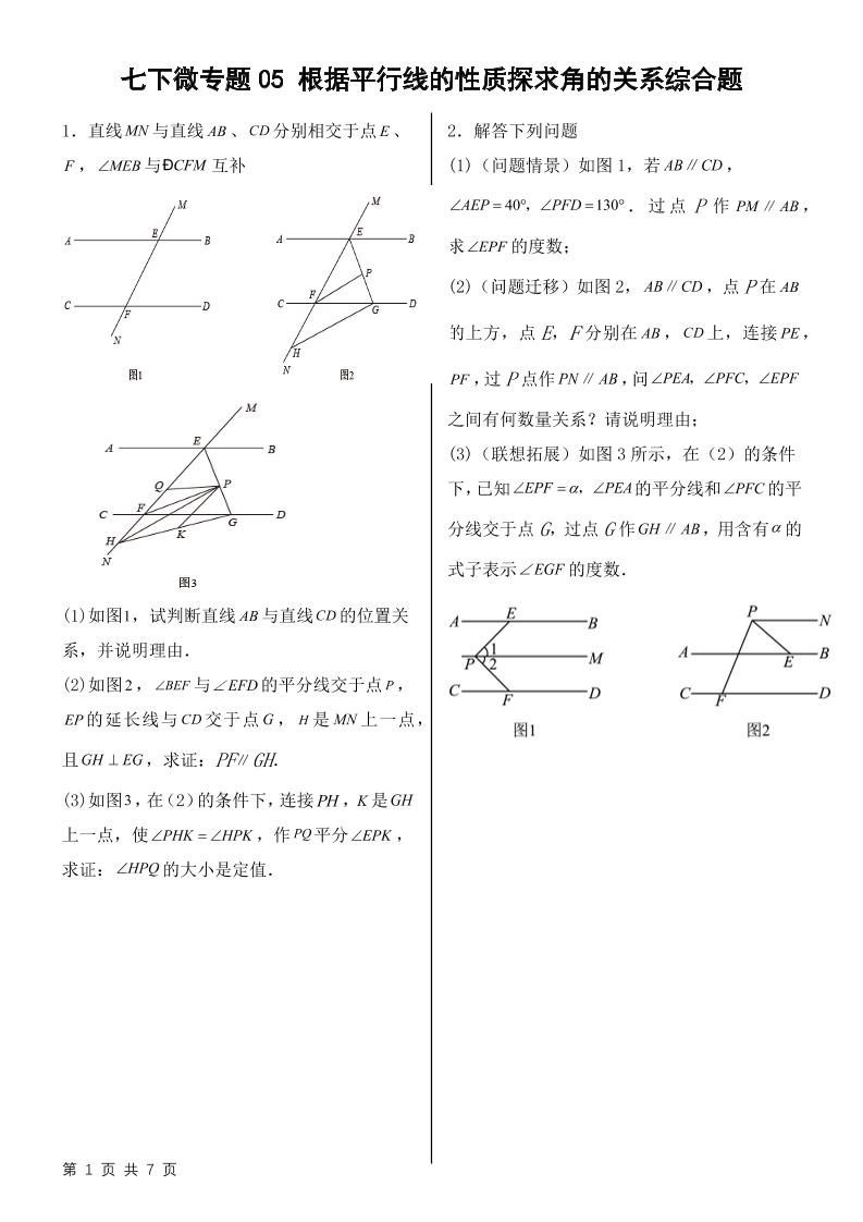 专题05 根据平行线的性质探求角的关系综合题(原卷版)