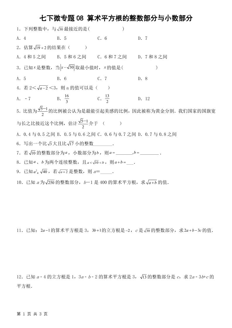 专题08 算术平方根的整数部分与小数部分(原卷版)