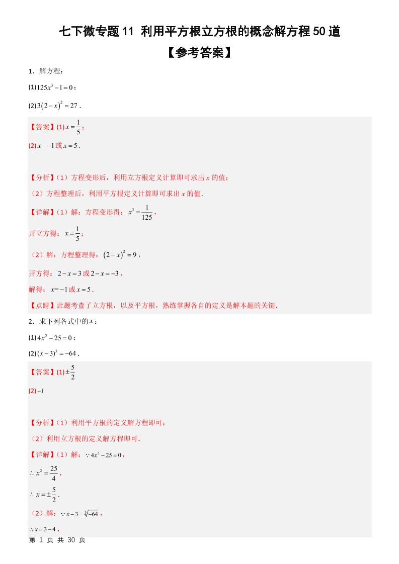 专题11 利用平方根立方根的概念解方程50道(解析版)