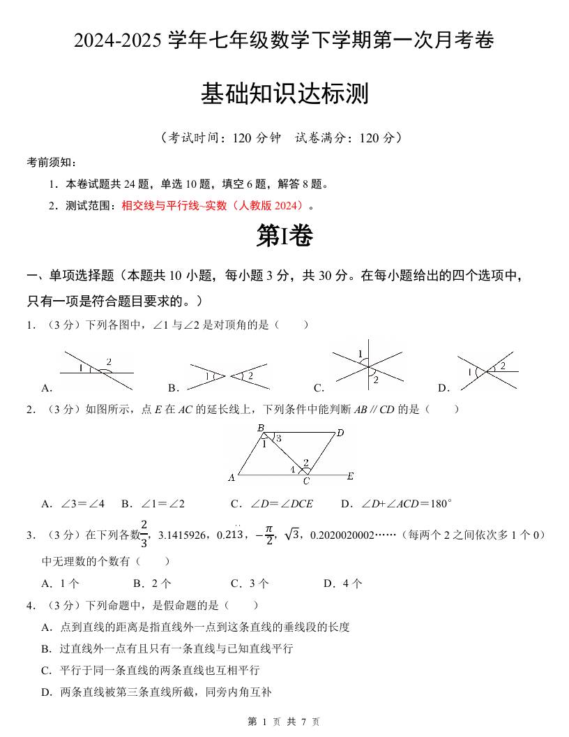 2025年第一次月考测试卷(基础卷)(考试版)【测试范围:相交线与平行线~实数】