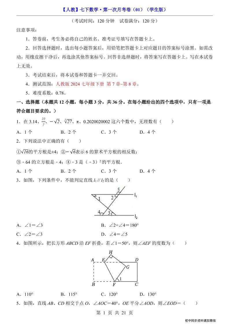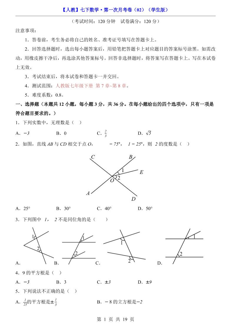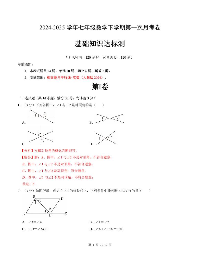 2025年第一次月考测试卷(基础卷)(解析版)【测试范围:相交线与平行线~实数】