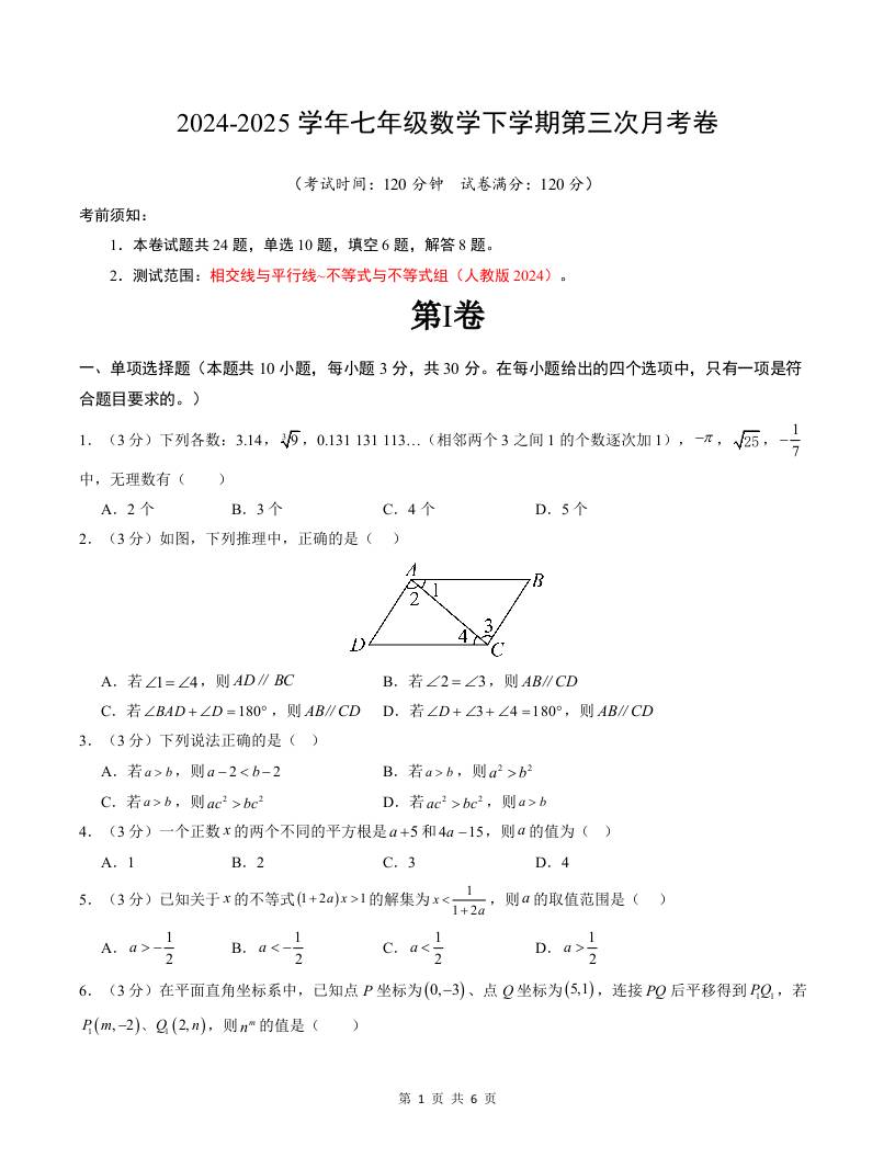 七年级数学下学期第三次月考测试卷(人教版2024)(考试版)【测试范围:相交线与平行线~不等式与不等式组】