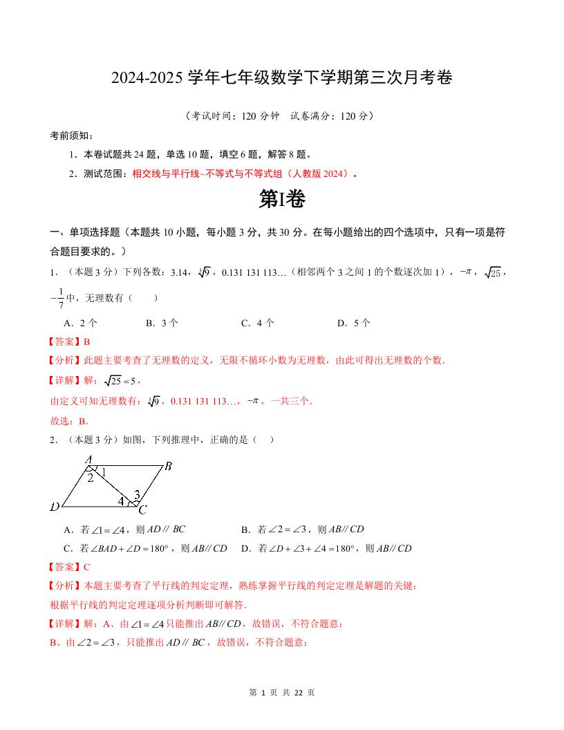 七年级数学下学期第三次月考测试卷(人教版2024)(解析版)【测试范围:相交线与平行线~不等式与不等式组】