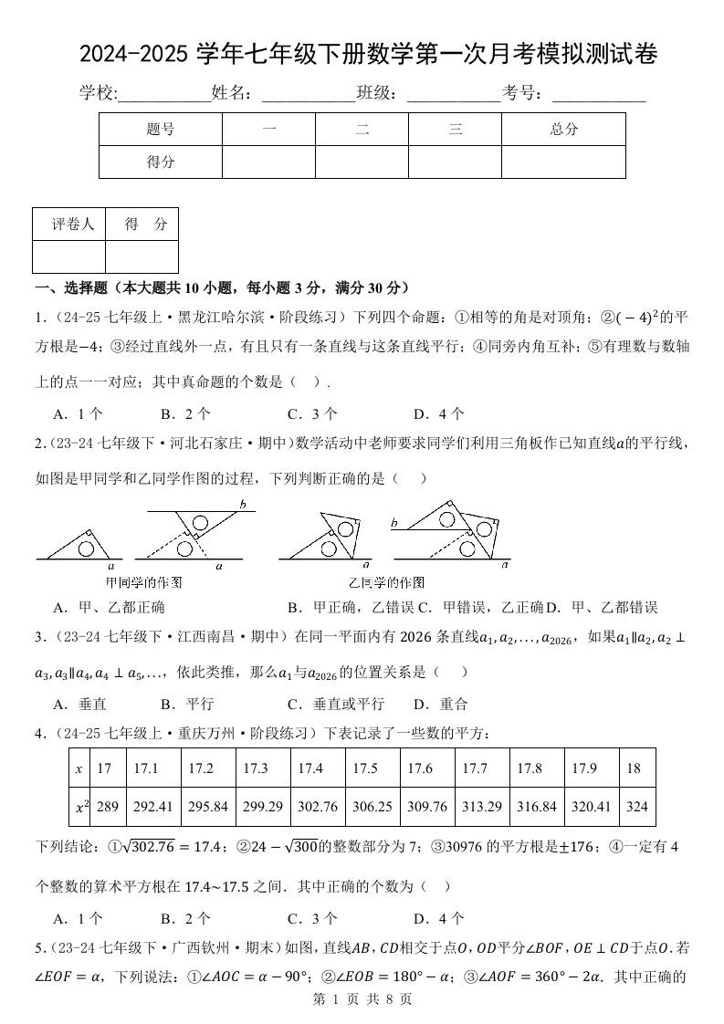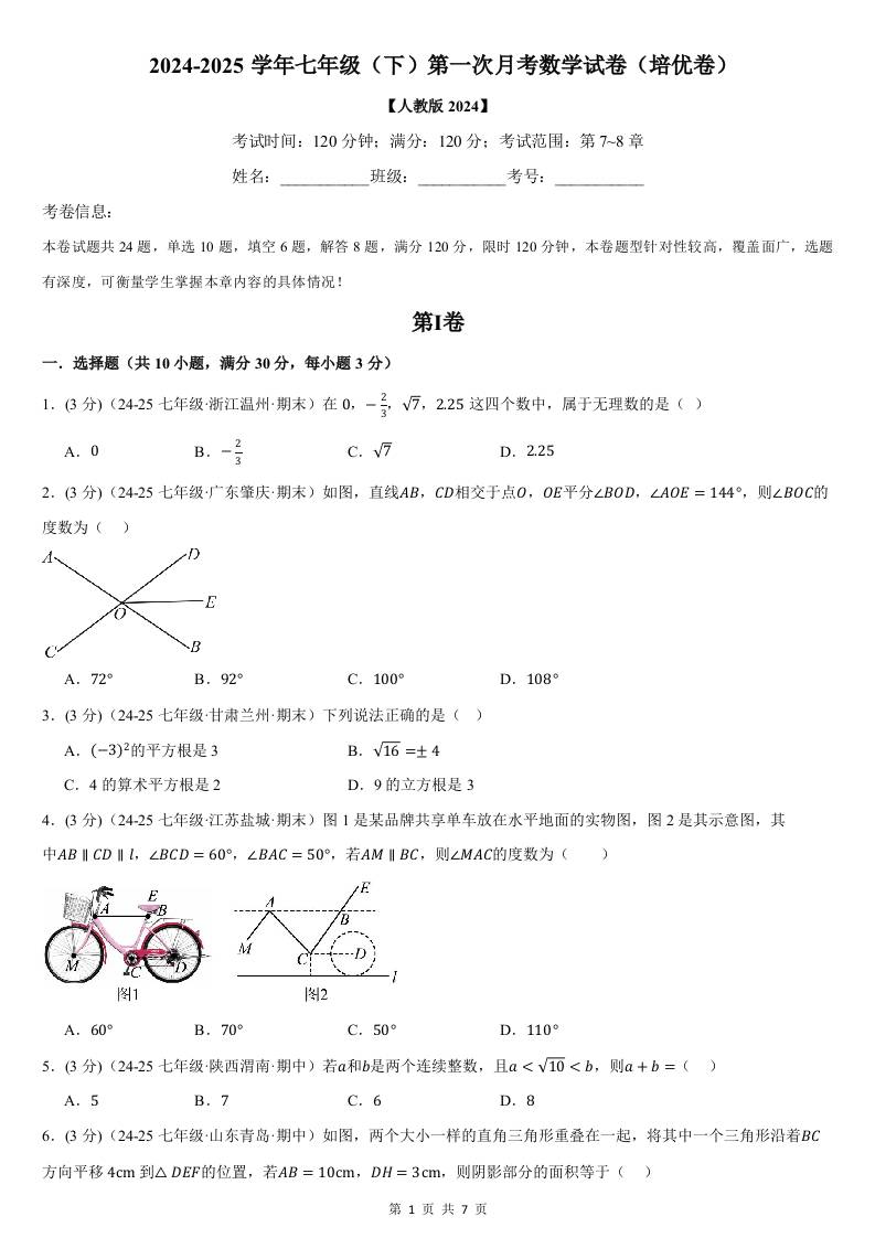 七年级(下)第一次月考数学试卷(3月份)(培优卷)(考查范围:第7~8章)(人教版2024)(原卷版)