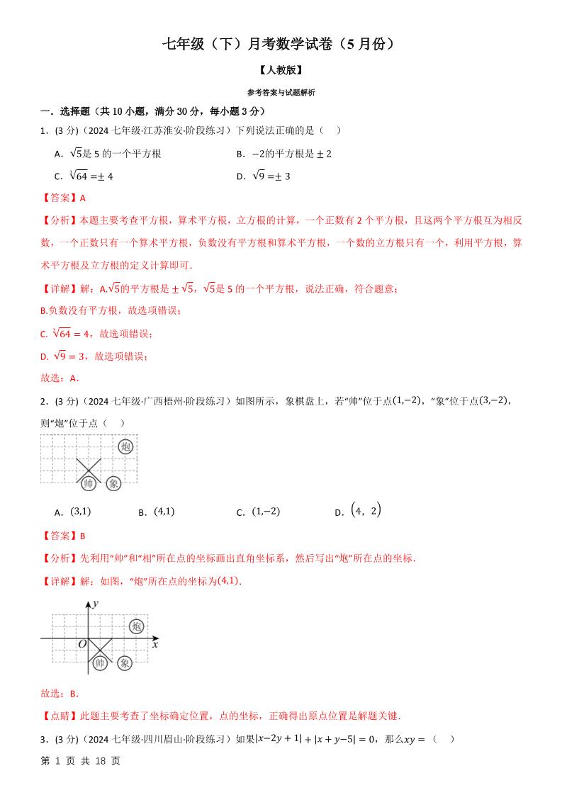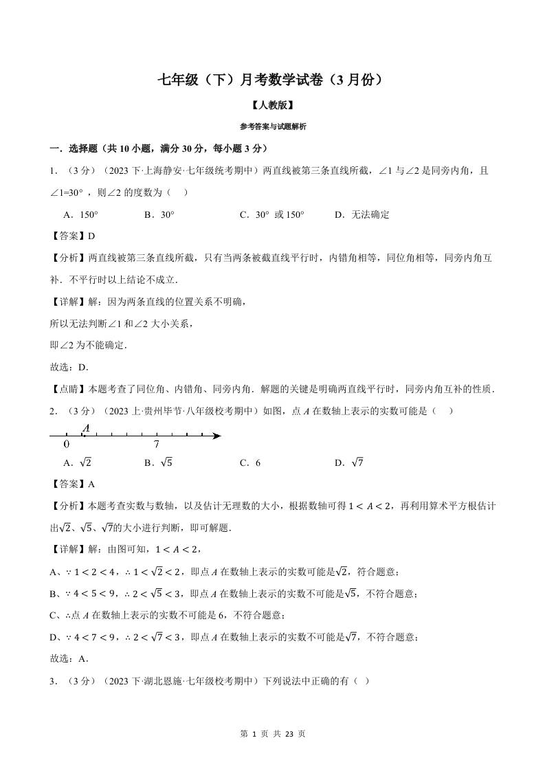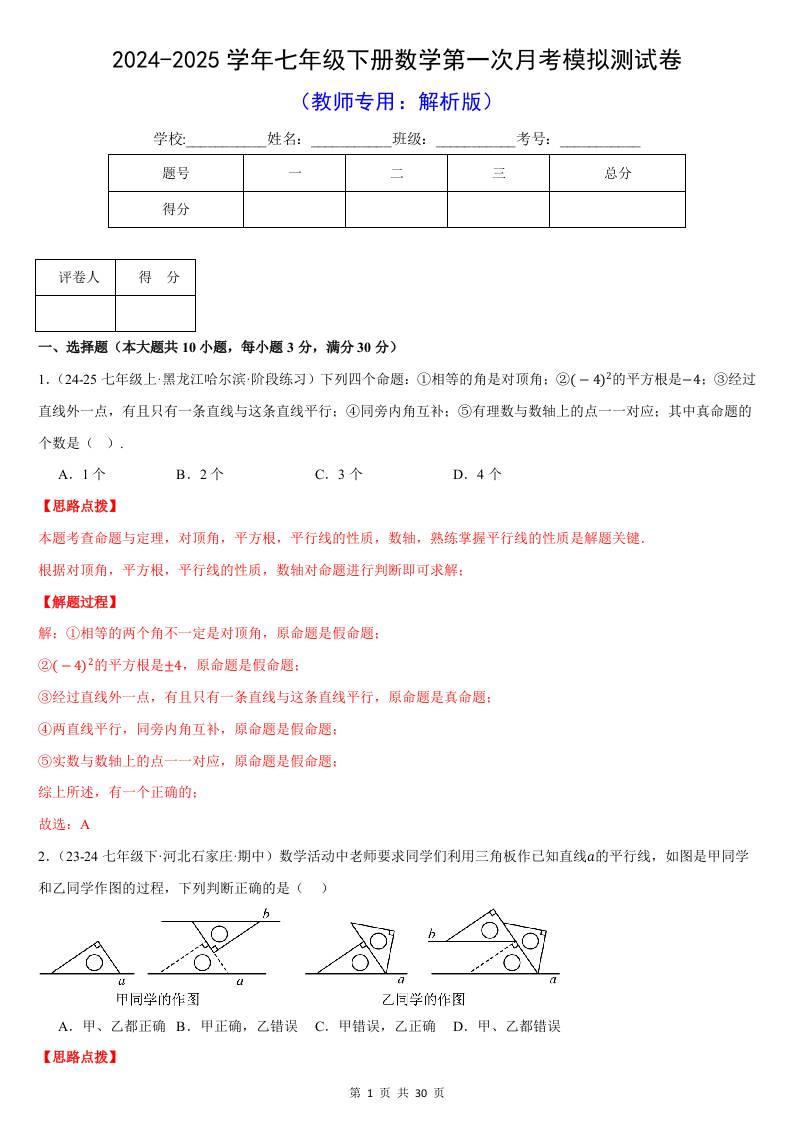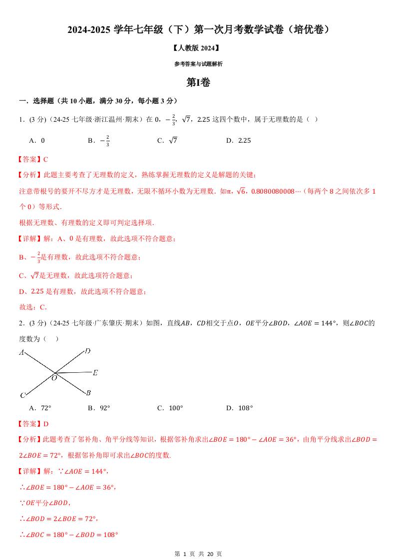 七年级(下)第一次月考数学试卷(3月份)(培优卷)(考查范围:第7~8章)(人教版2024)(解析版)