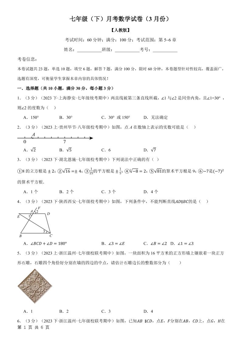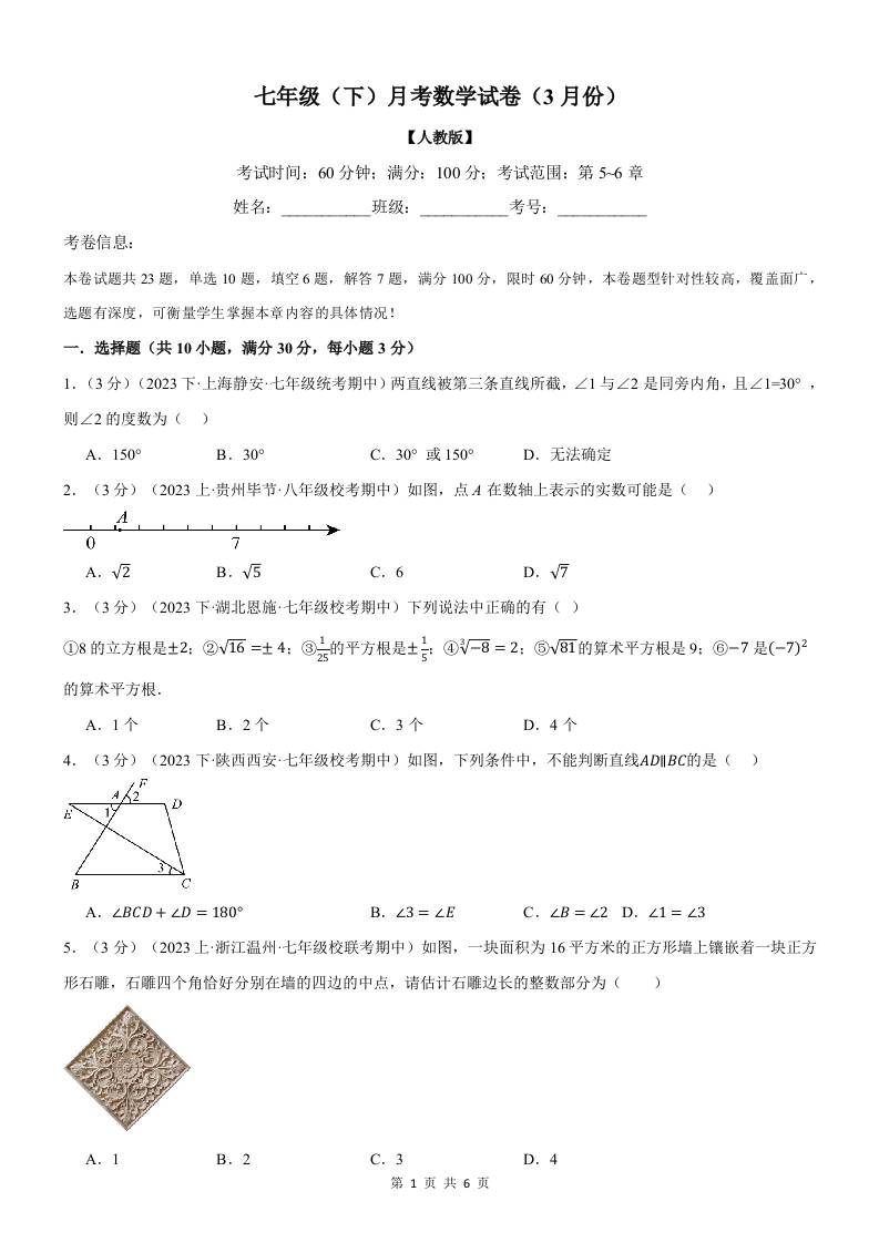七年级(下)数学月考试卷(3月份)(考查范围:第7~8章)(人教版)(原卷版)