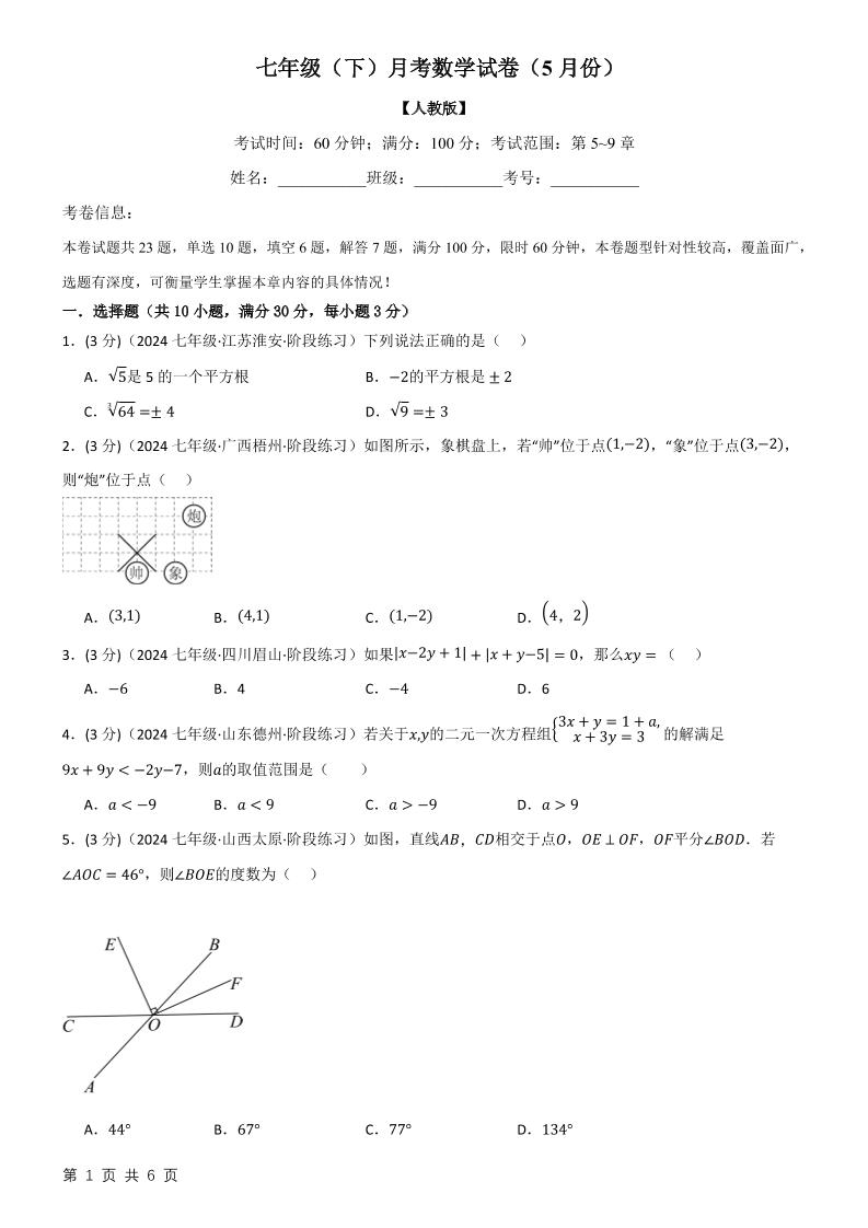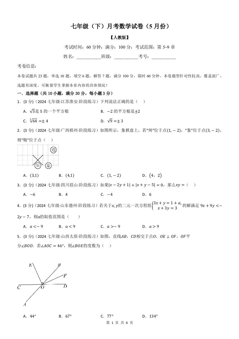 七年级(下)月考数学试卷(5月份)(考查范围:第7~10章)(人教版)(原卷版)
