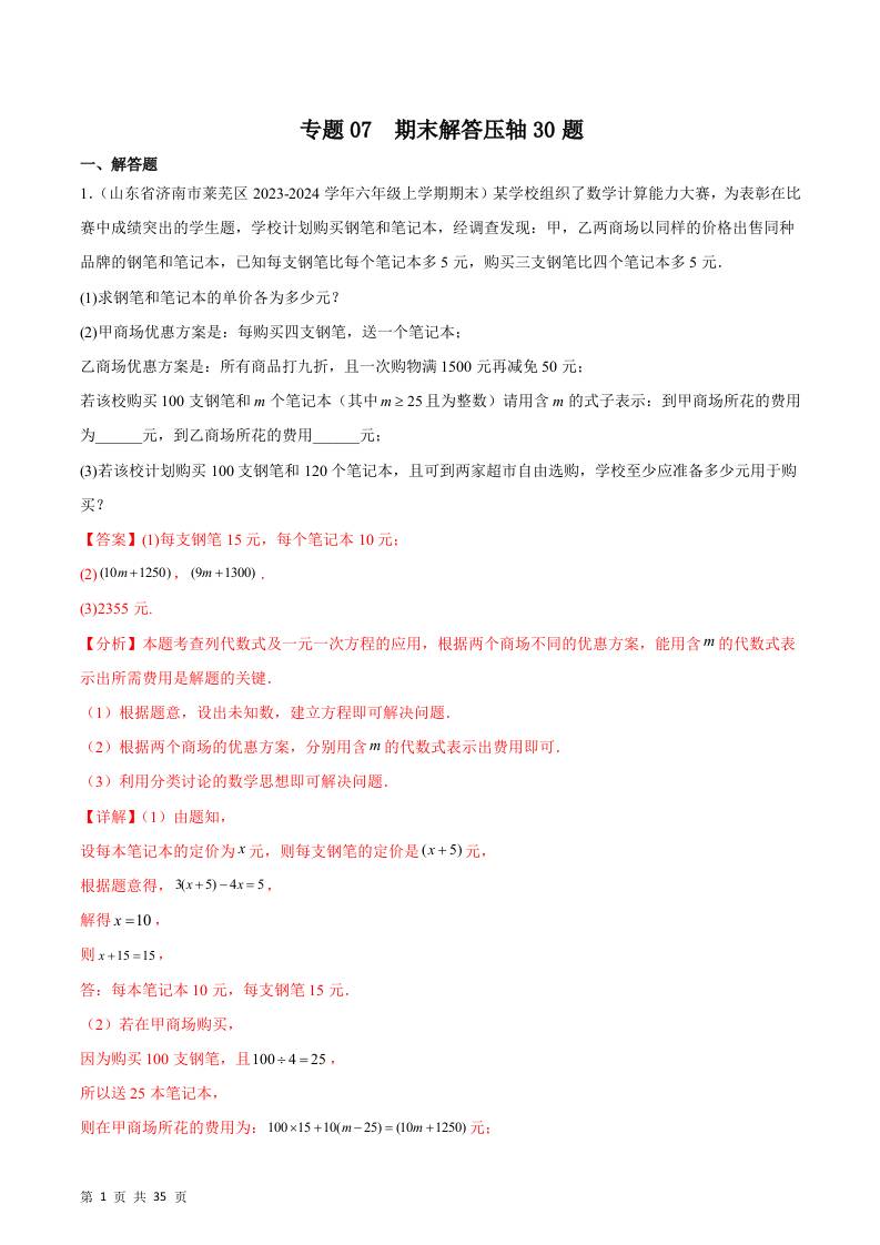 专题07 期末解答压轴30题(解析版).