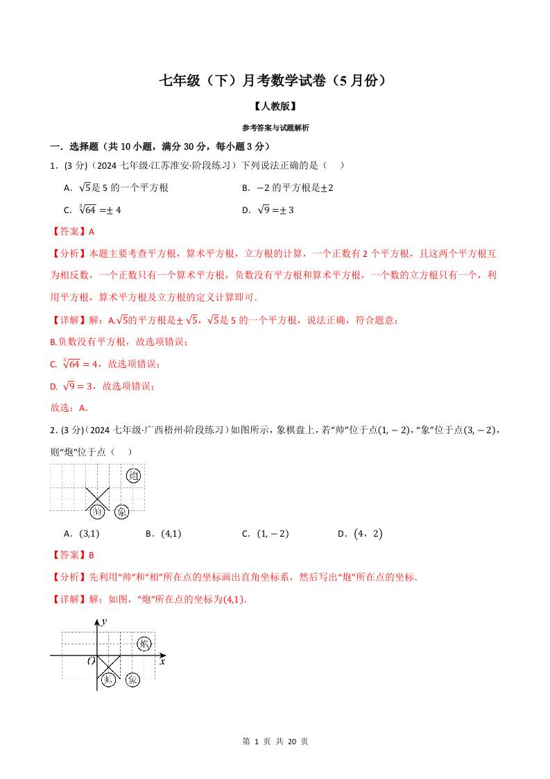 专题13.1 七年级(下)数学月考试卷(3月份)(考查范围:第7~8章)(人教版)(解析版)