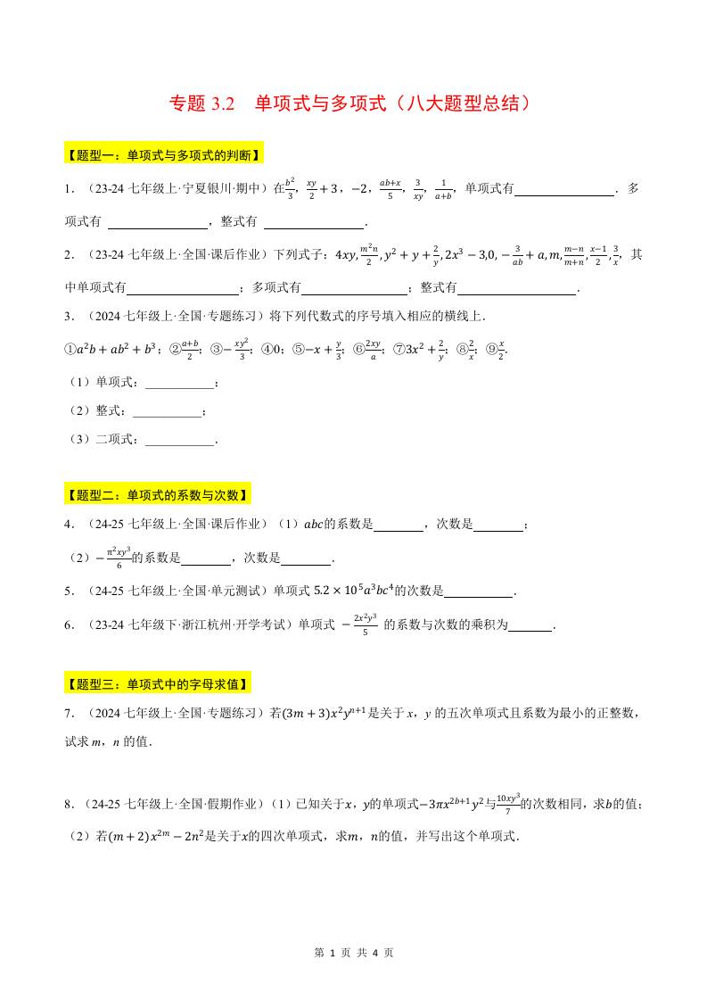专题3.2 单项式与多项式(八大题型总结)(压轴题专项讲练)(原卷版)