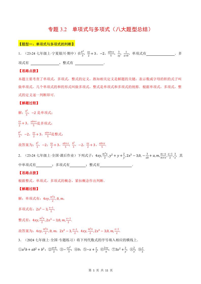 专题3.2 单项式与多项式(八大题型总结)(压轴题专项讲练)(解析版)