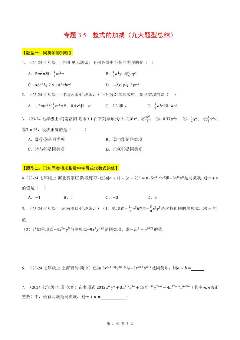 专题3.5 整式的加减(九大题型总结)(压轴题专项讲练)(原卷版)