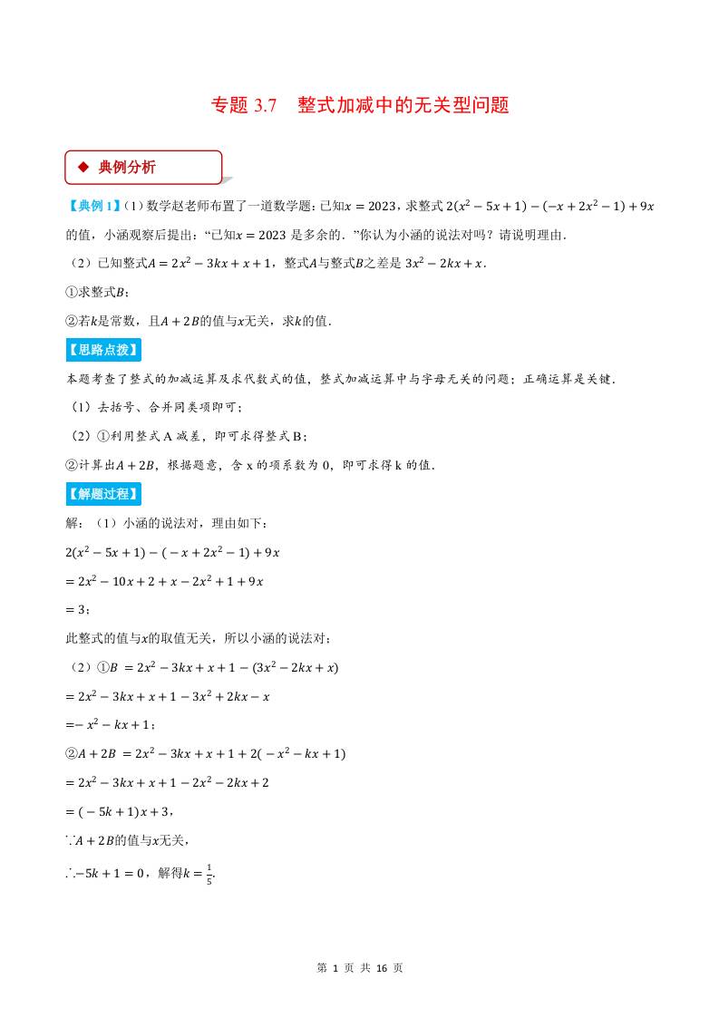 专题3.7 整式加减中的无关型问题(压轴题专项讲练)(解析版)