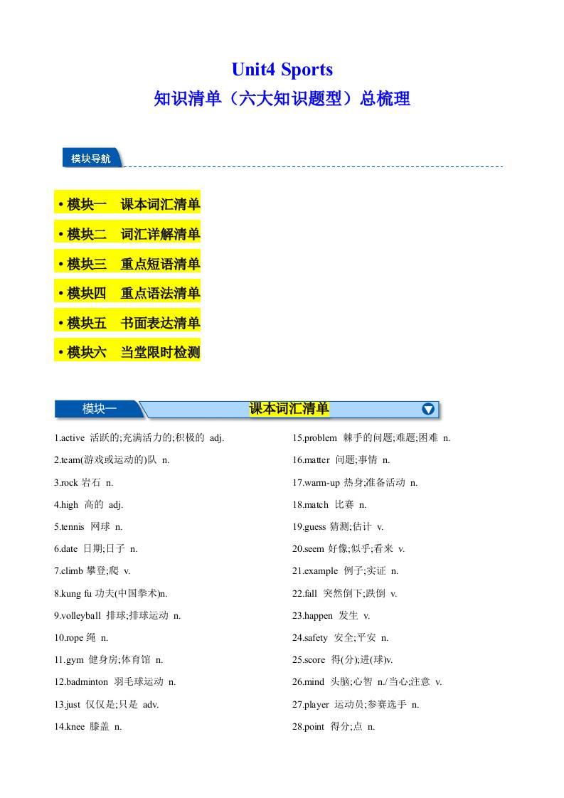 Unit4 Sports 知识清单(六大知识题型)总梳理(原卷版)