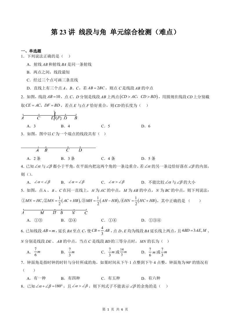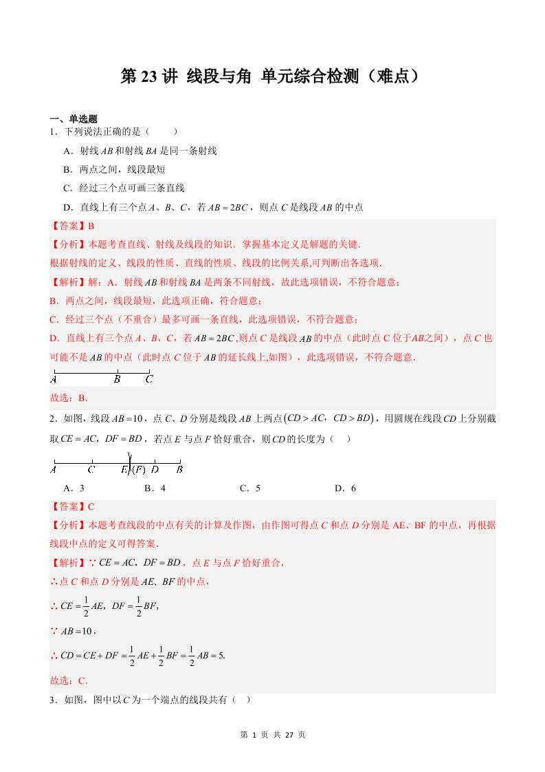 【沪教】第23讲:线段与角单元综合检测(难点)(原卷版)