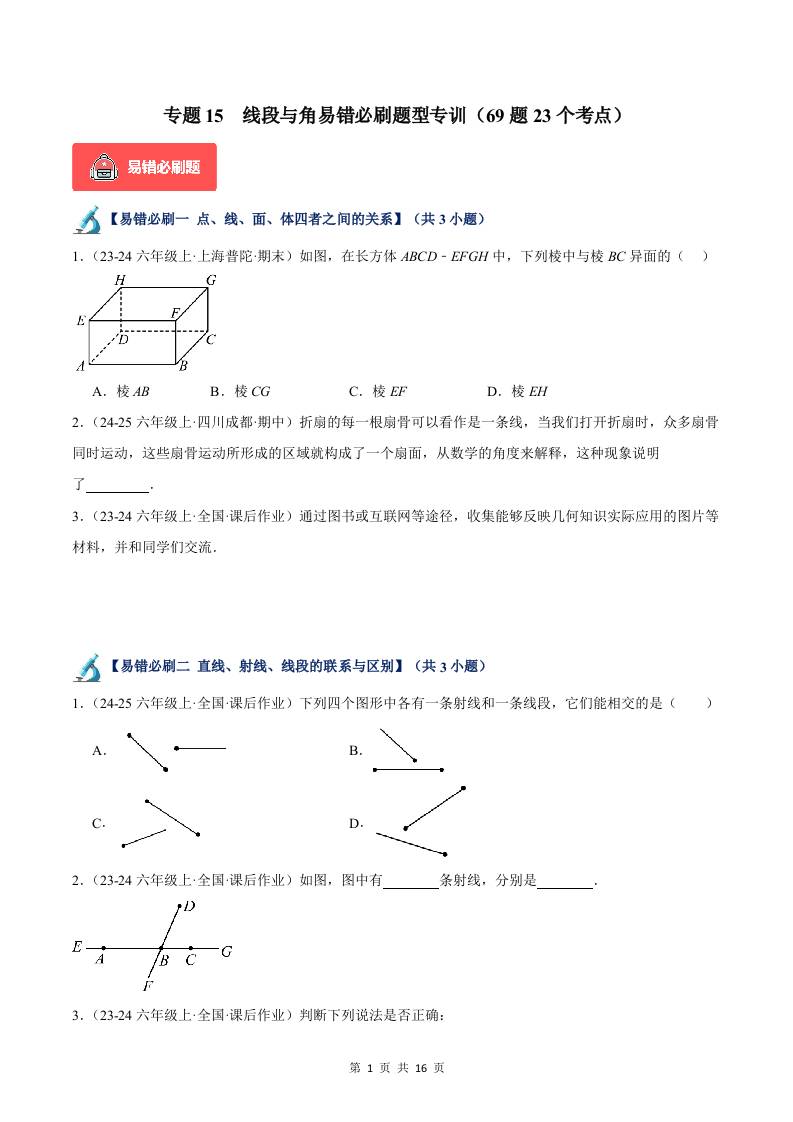 专题15:线段与角易错必刷题型专训(69题23个考点)(沪教版2024)(原卷版)