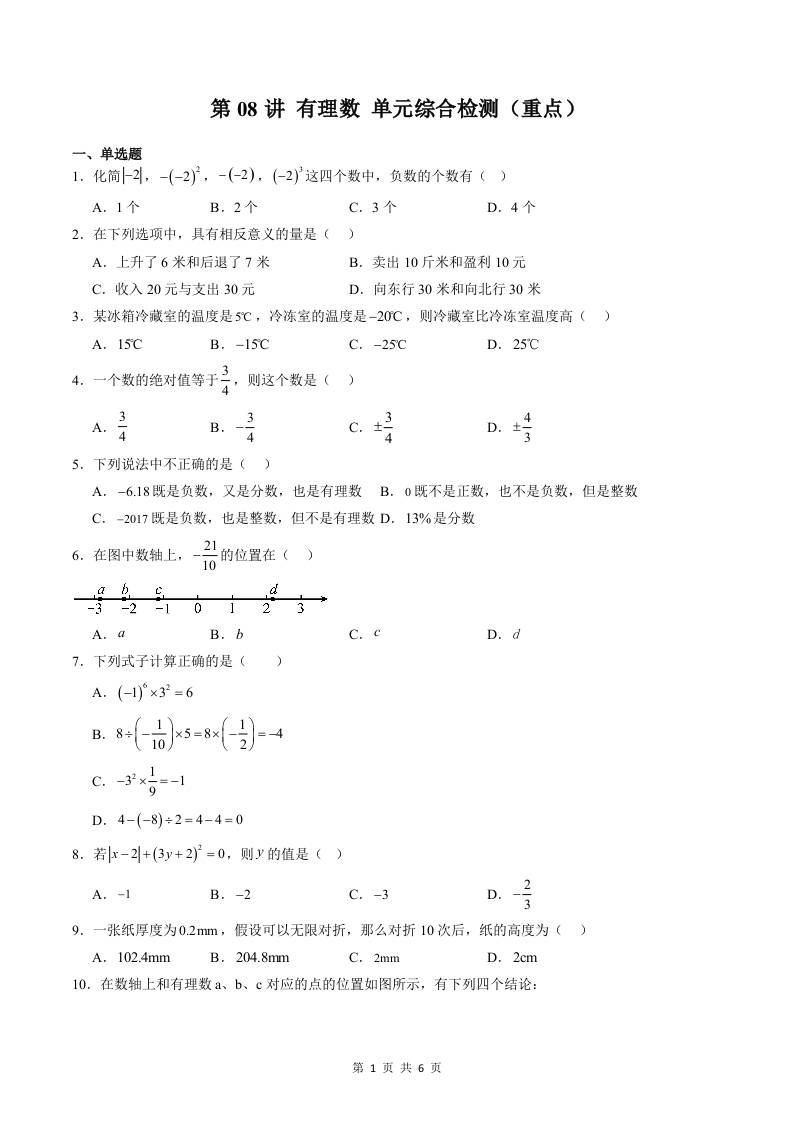 【沪教】第08讲:有理数单元综合检测(重点)(原卷版)
