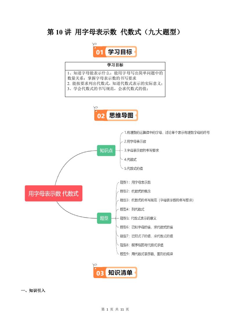 【沪教】第10讲:用字母表示数代数式(九大题型)(原卷版)