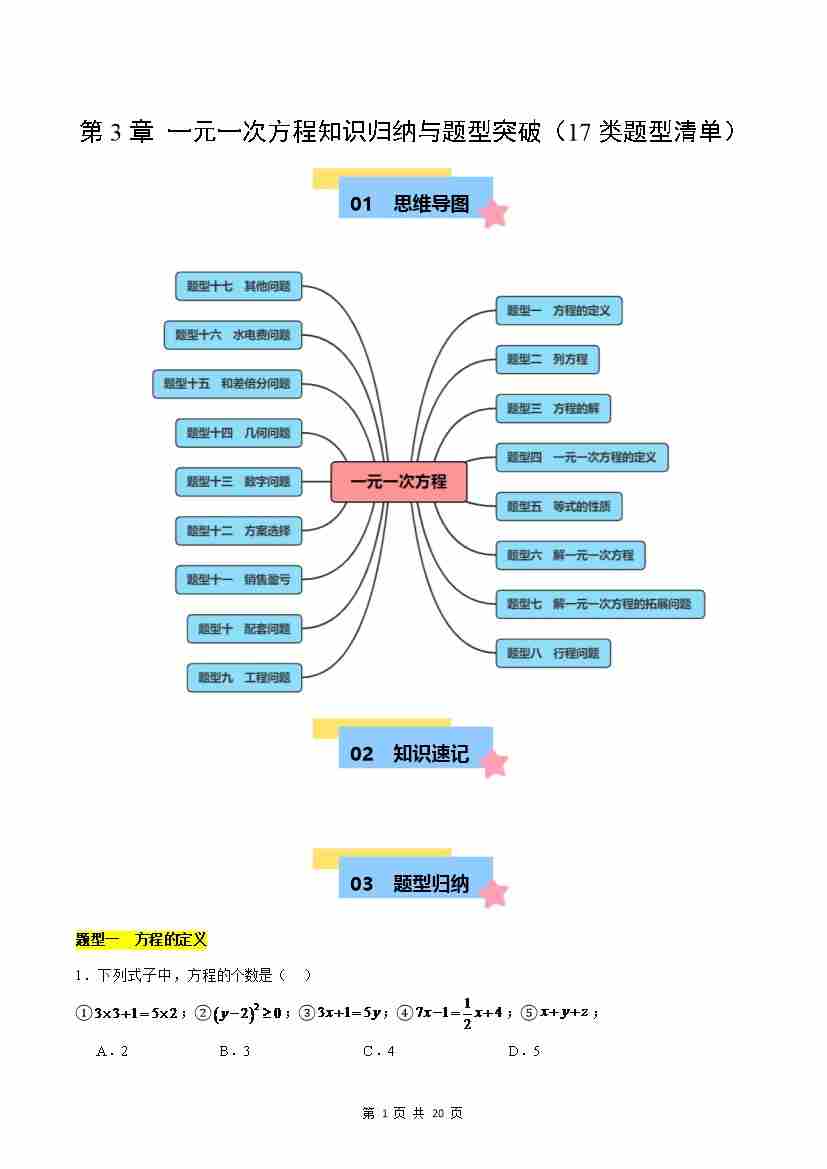 【沪教】第3章:一元一次方程知识归纳与题型突破(17类题型清单)(原卷版)