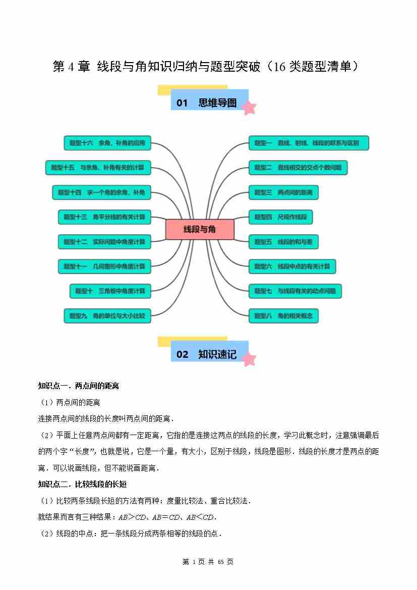 【沪教】第4章:线段与角知识归纳与题型突破(16类题型清单)(原卷版)
