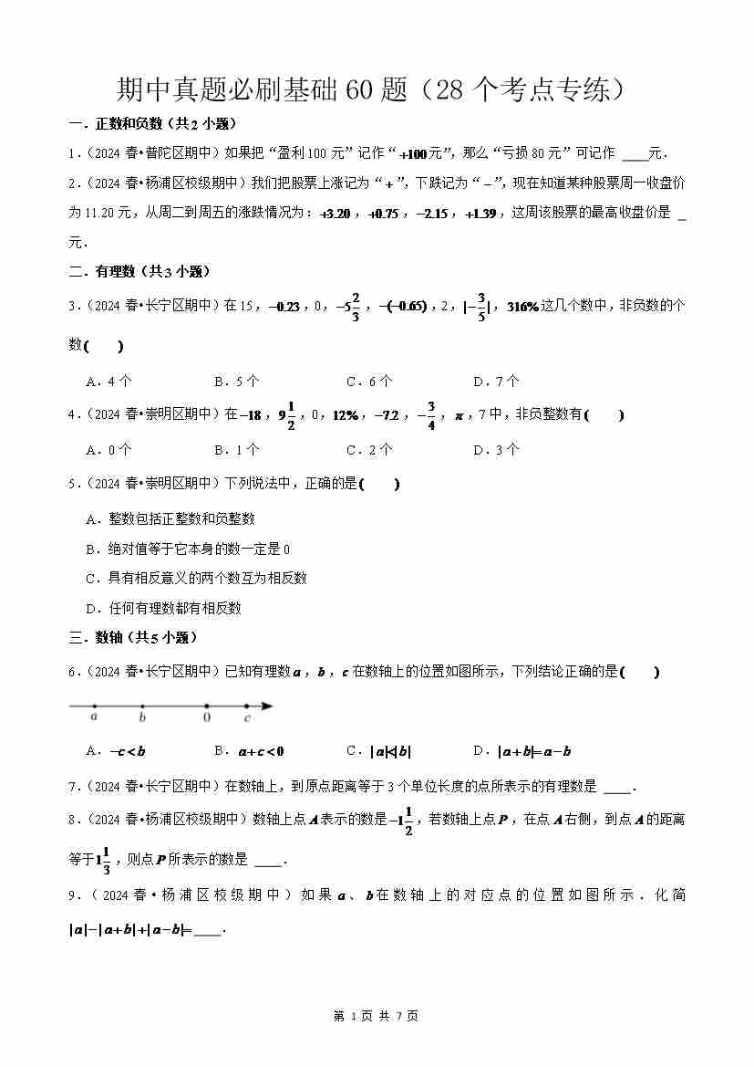 上海市六年级上学期期中真题必刷基础60题(28个考点专练)原卷版