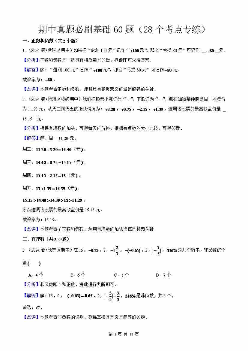 上海市六年级上学期期中真题必刷基础60题(28个考点专练)解析版