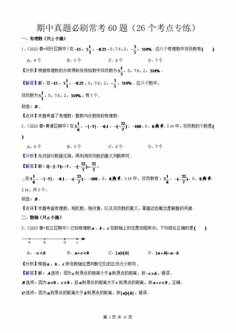 上海市六年级上学期期中真题必刷常考60题(26个考点专练)解析版
