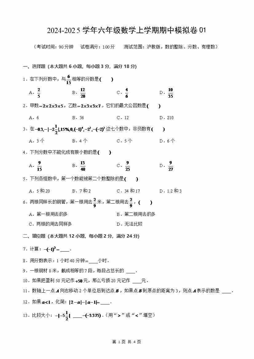 六年级数学上学期期中模拟卷01(测试范围:数的整除、分数、有理数)原卷版