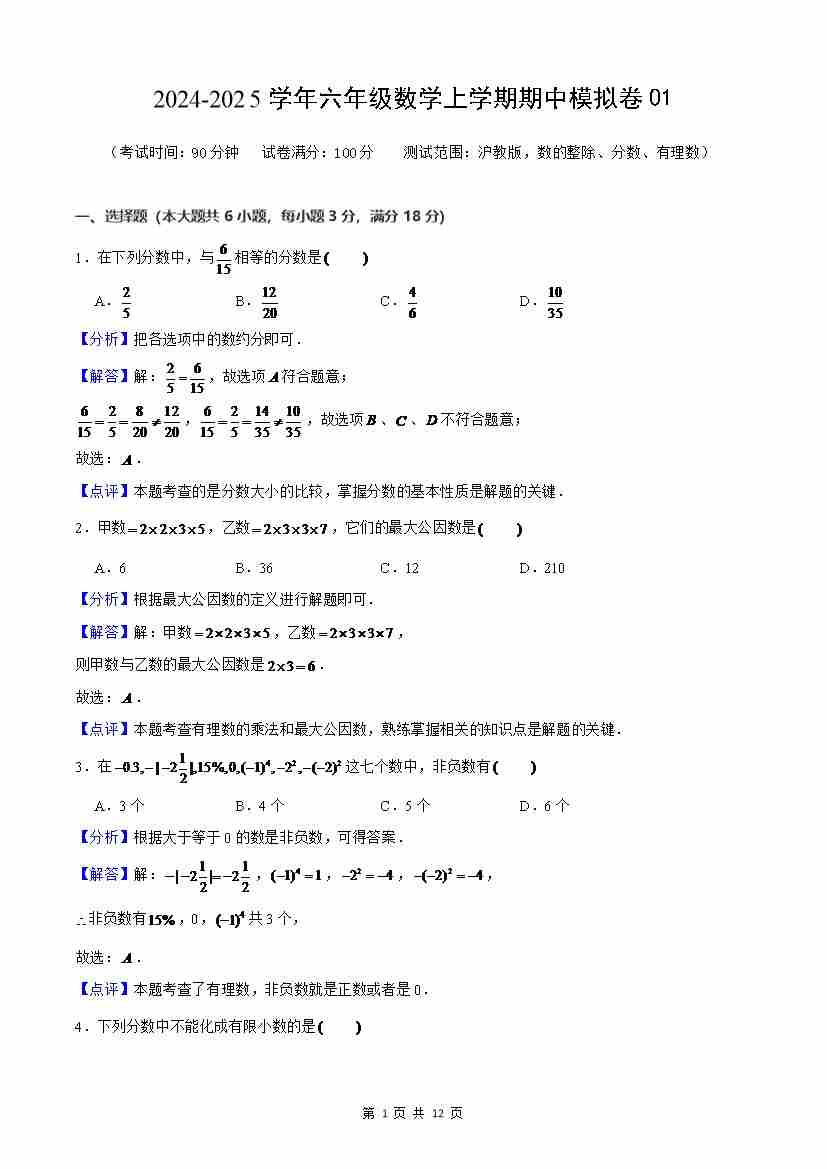 六年级数学上学期期中模拟卷01(测试范围:数的整除、分数、有理数)解析版