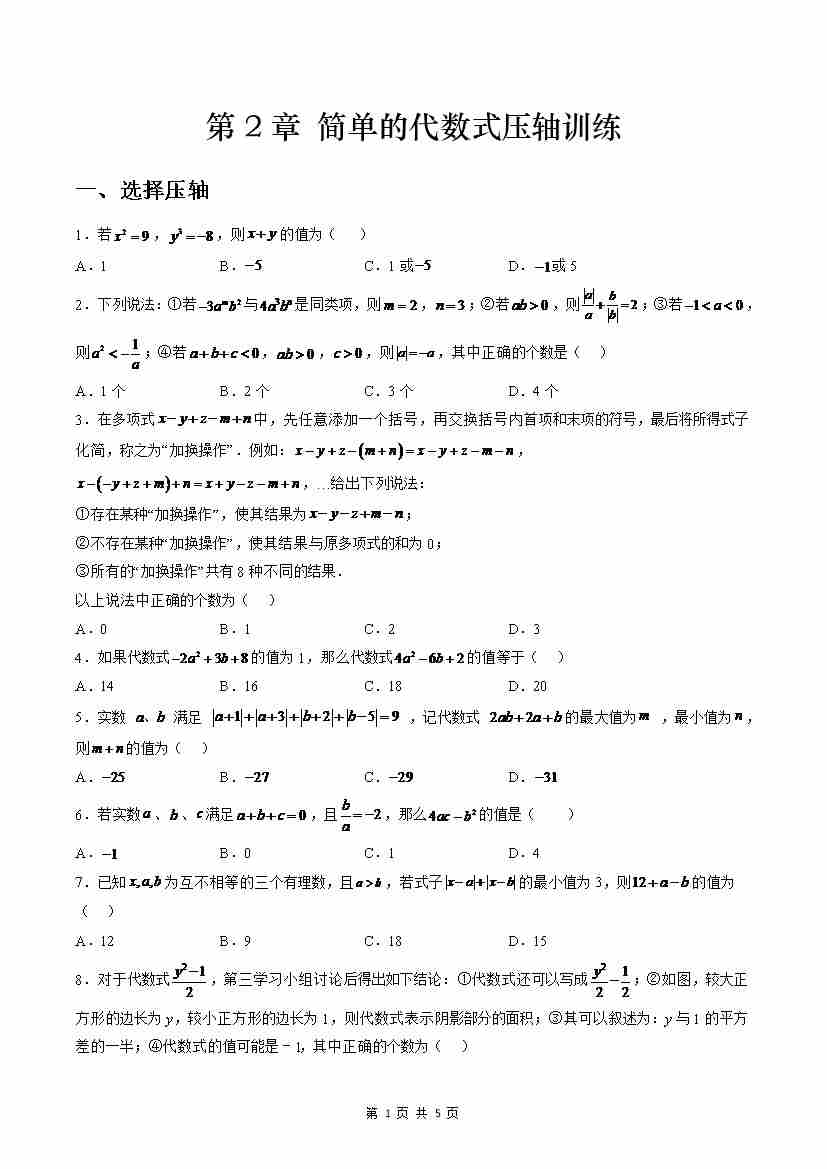 【沪教】第2章:简单的代数式压轴训练(原卷版)