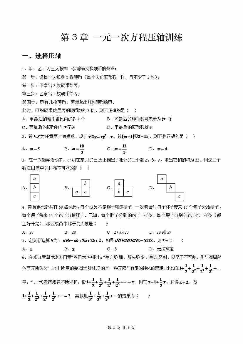 【沪教】第3章:一元一次方程压轴训练(原卷版)