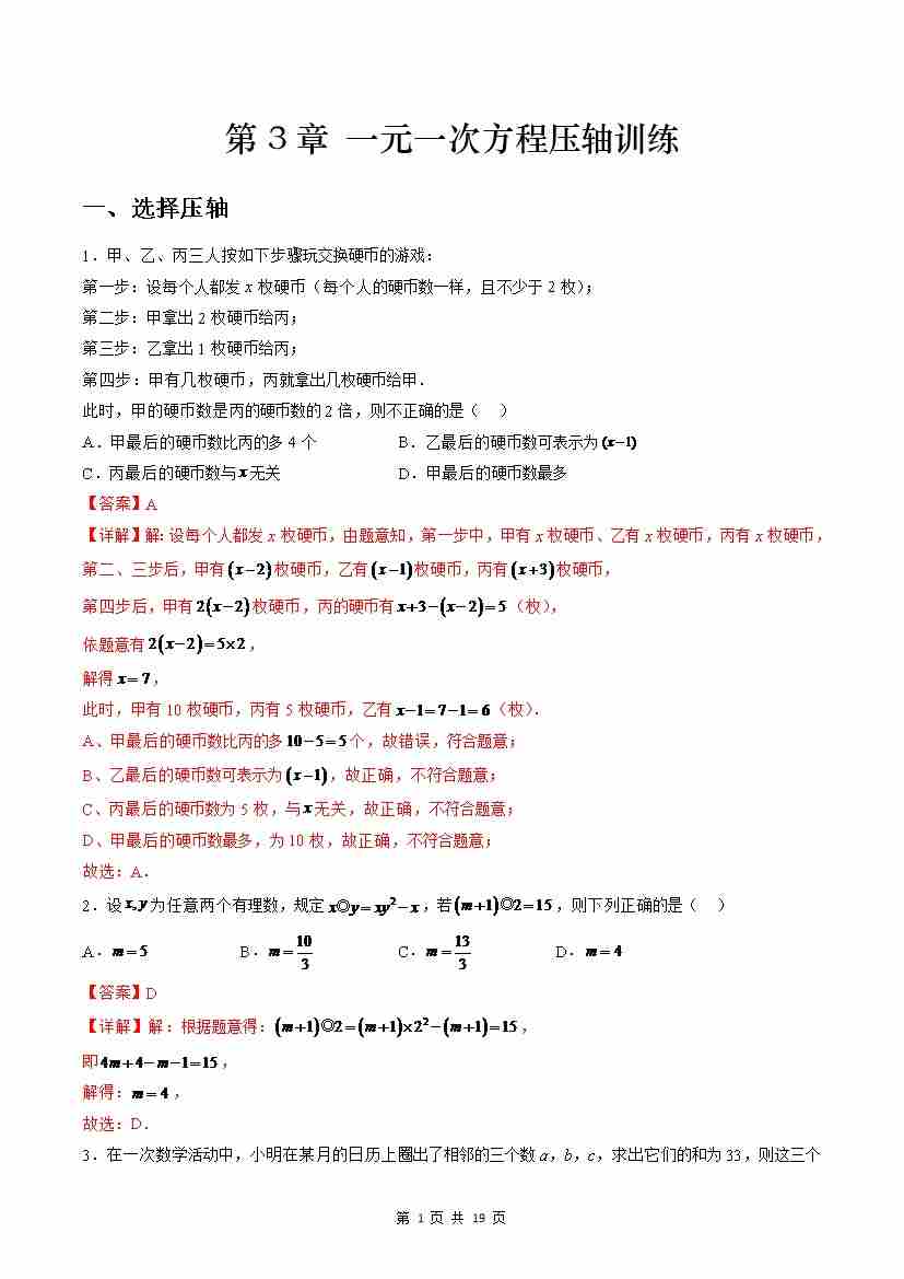 【沪教】第3章:一元一次方程压轴训练(解析版)