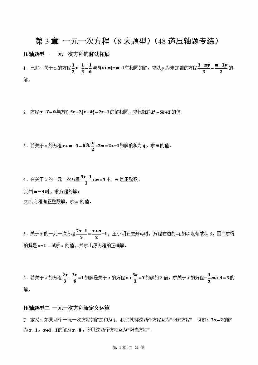 【沪教】第3章:一元一次方程(8大题型)(48道压轴题专练)(原卷版)