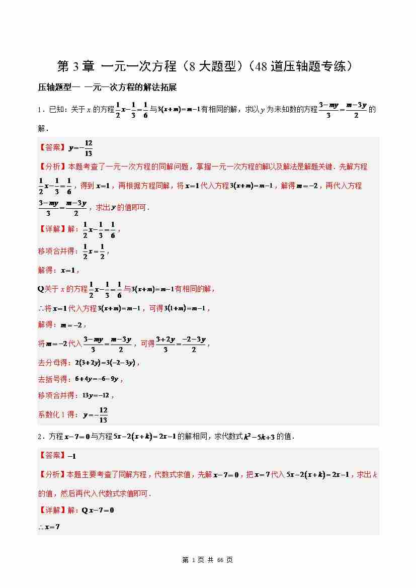【沪教】第3章:一元一次方程(8大题型)(48道压轴题专练)(解析版)